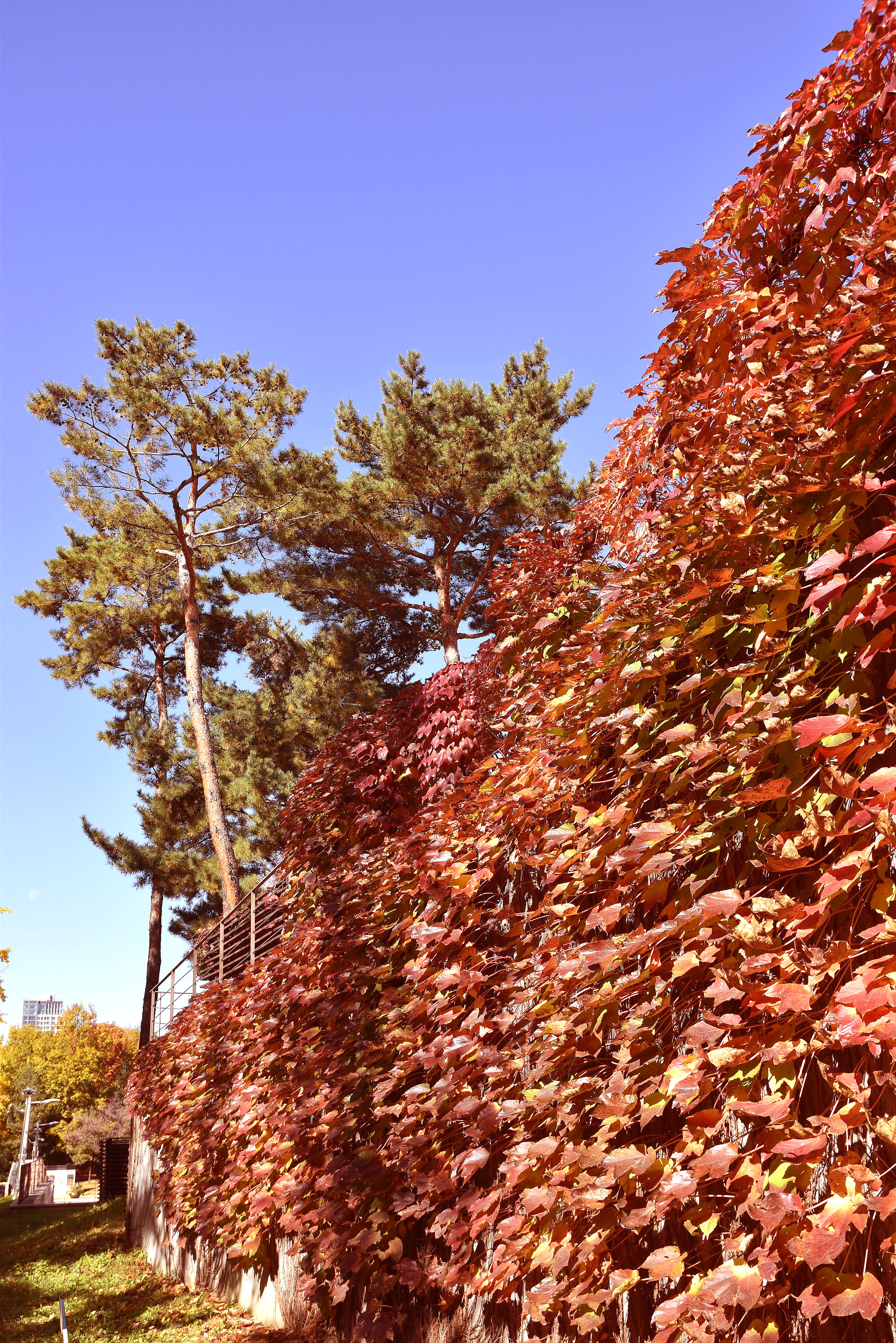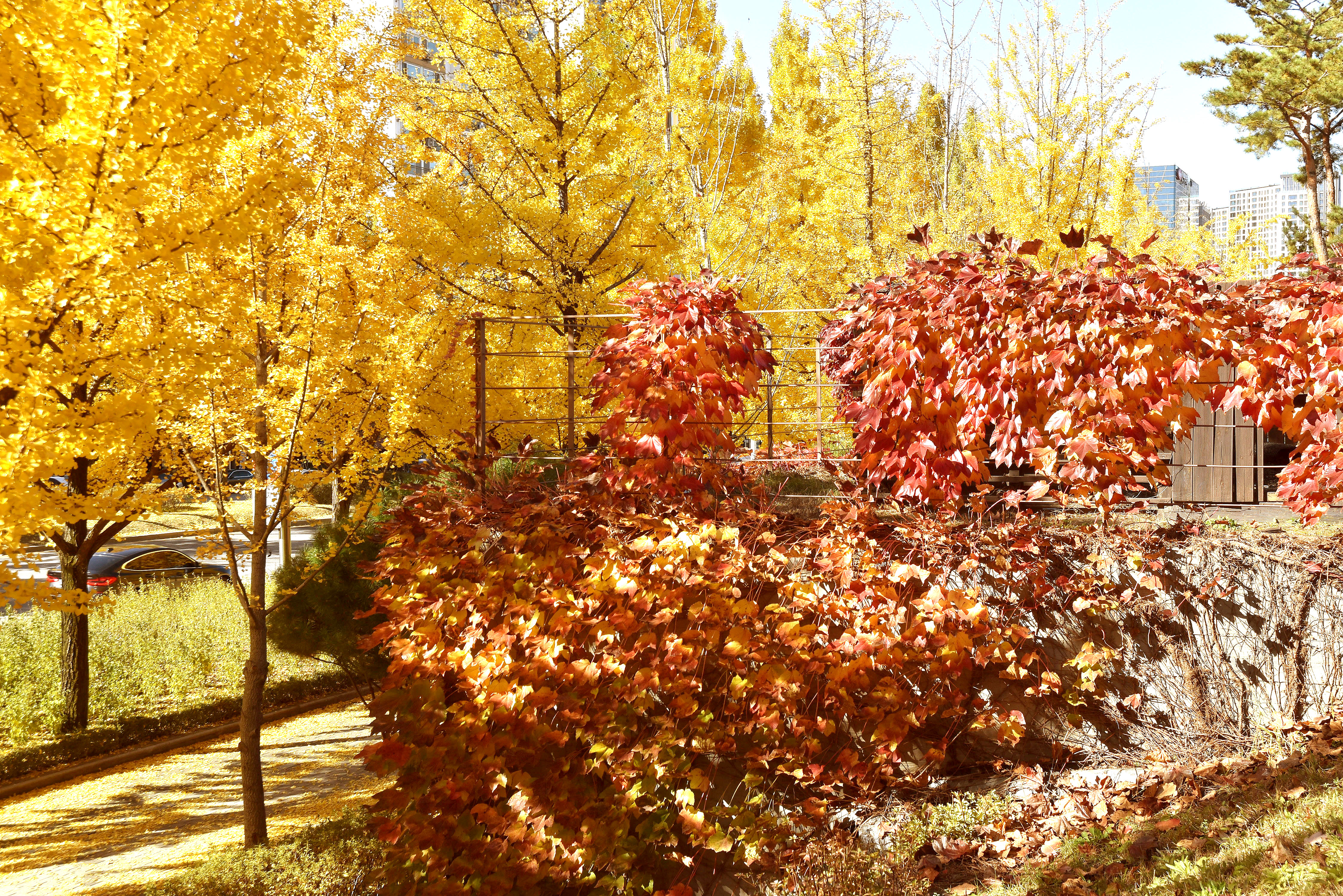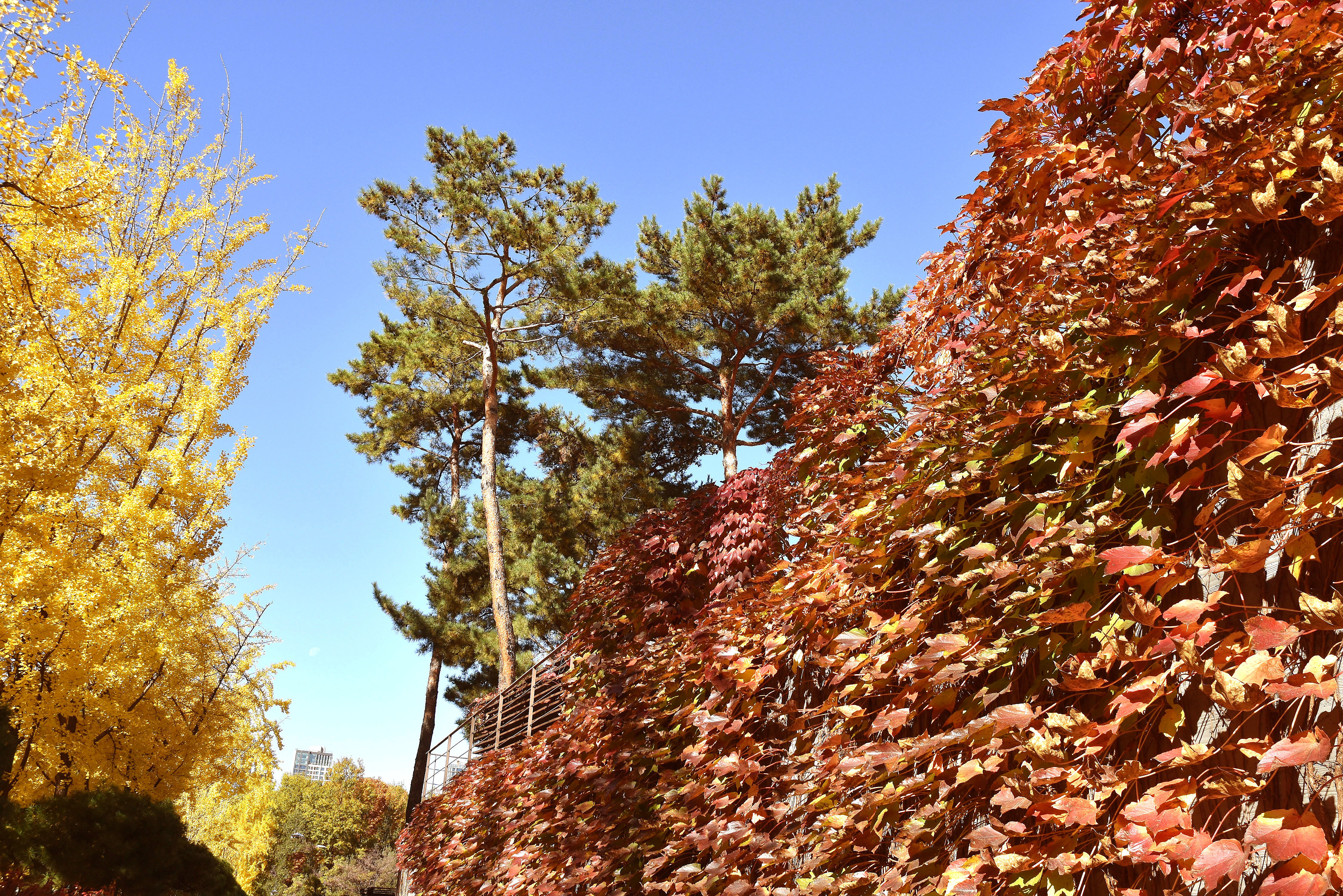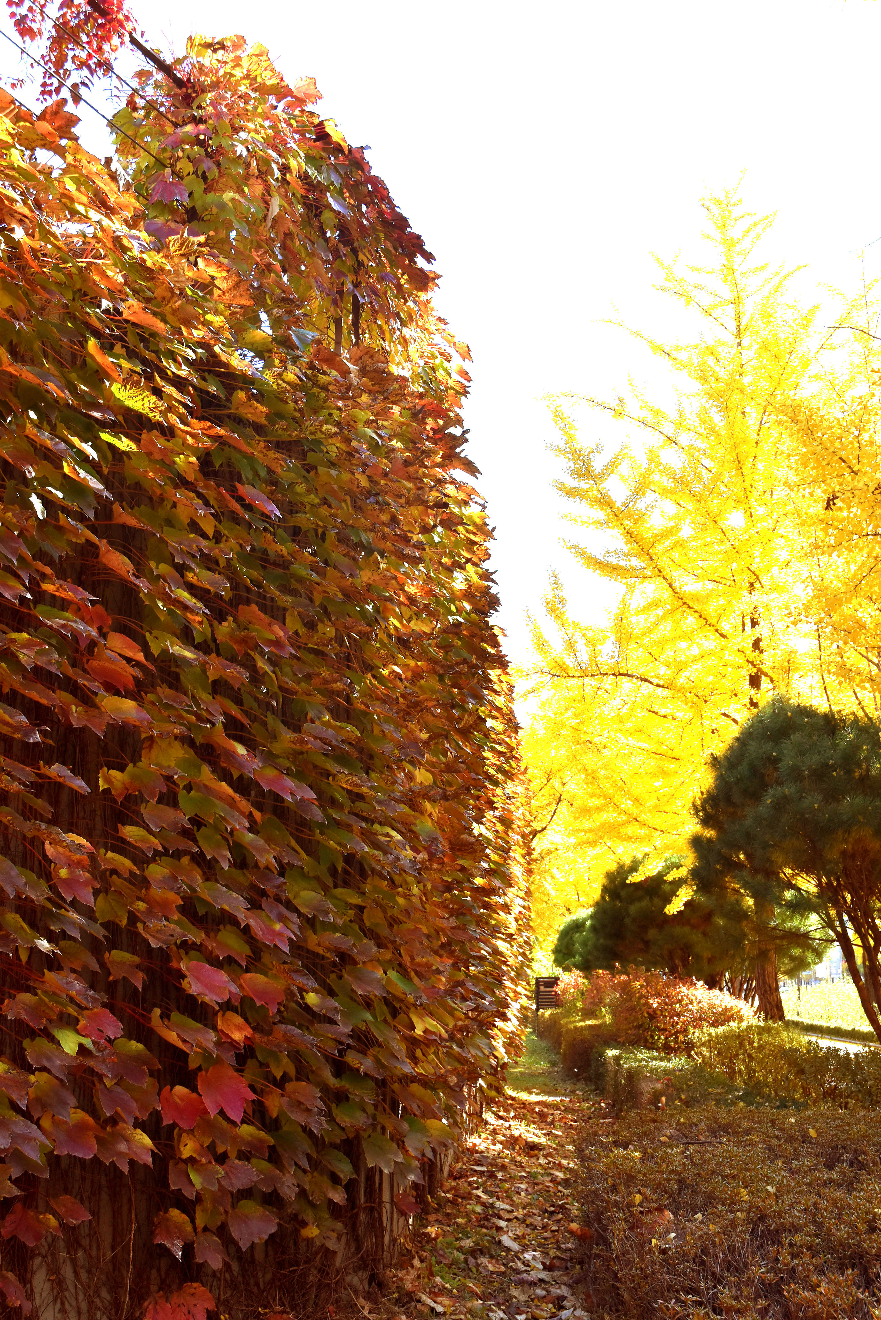 붉게 물들어가는 담쟁이와 노란 은행나무와의 조화