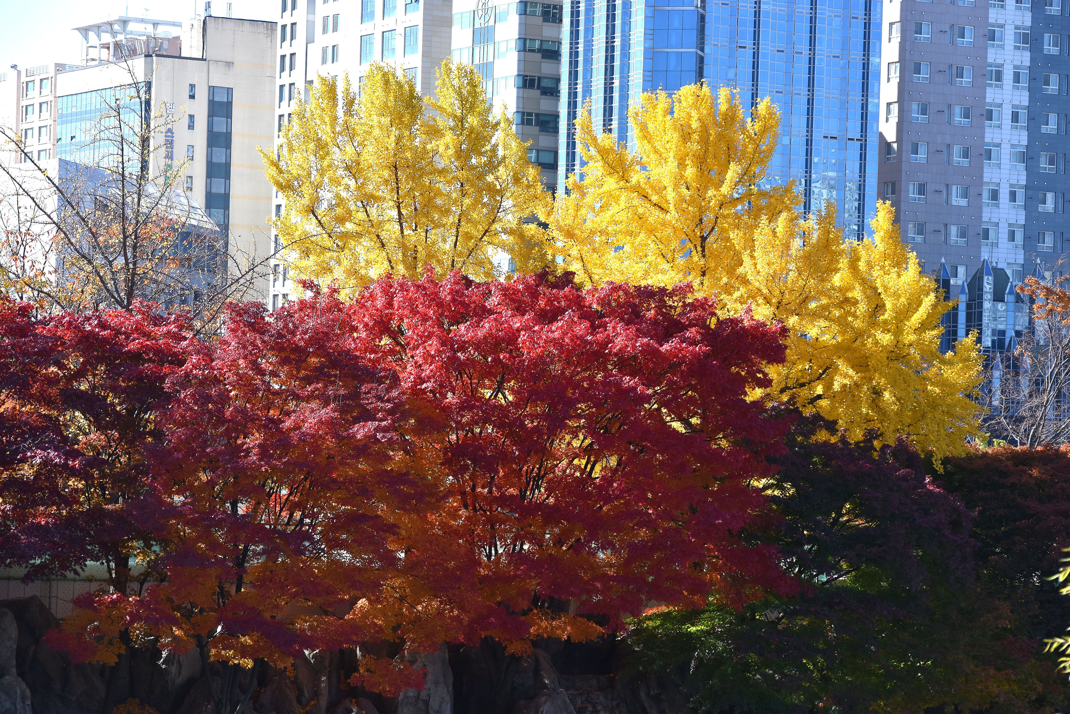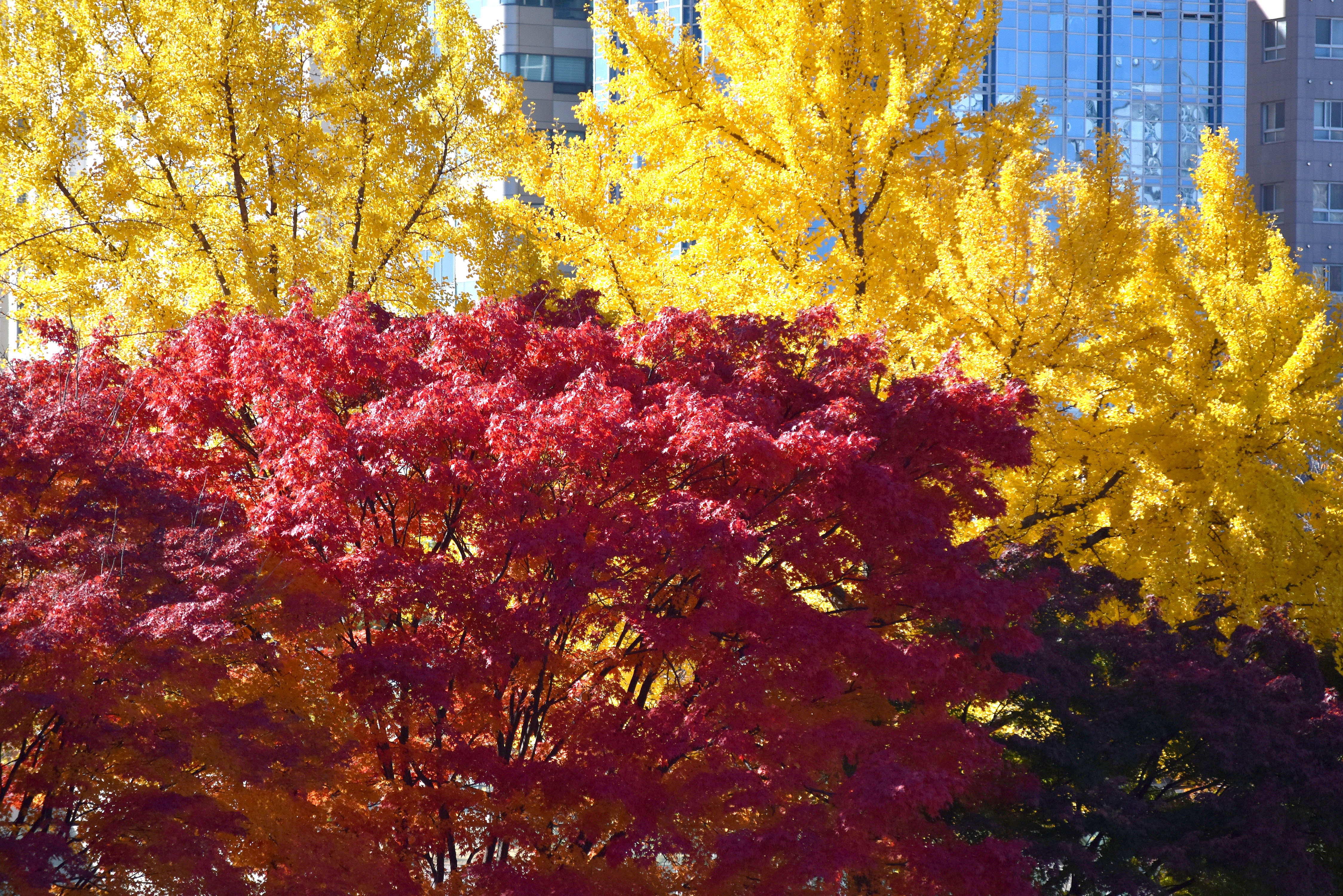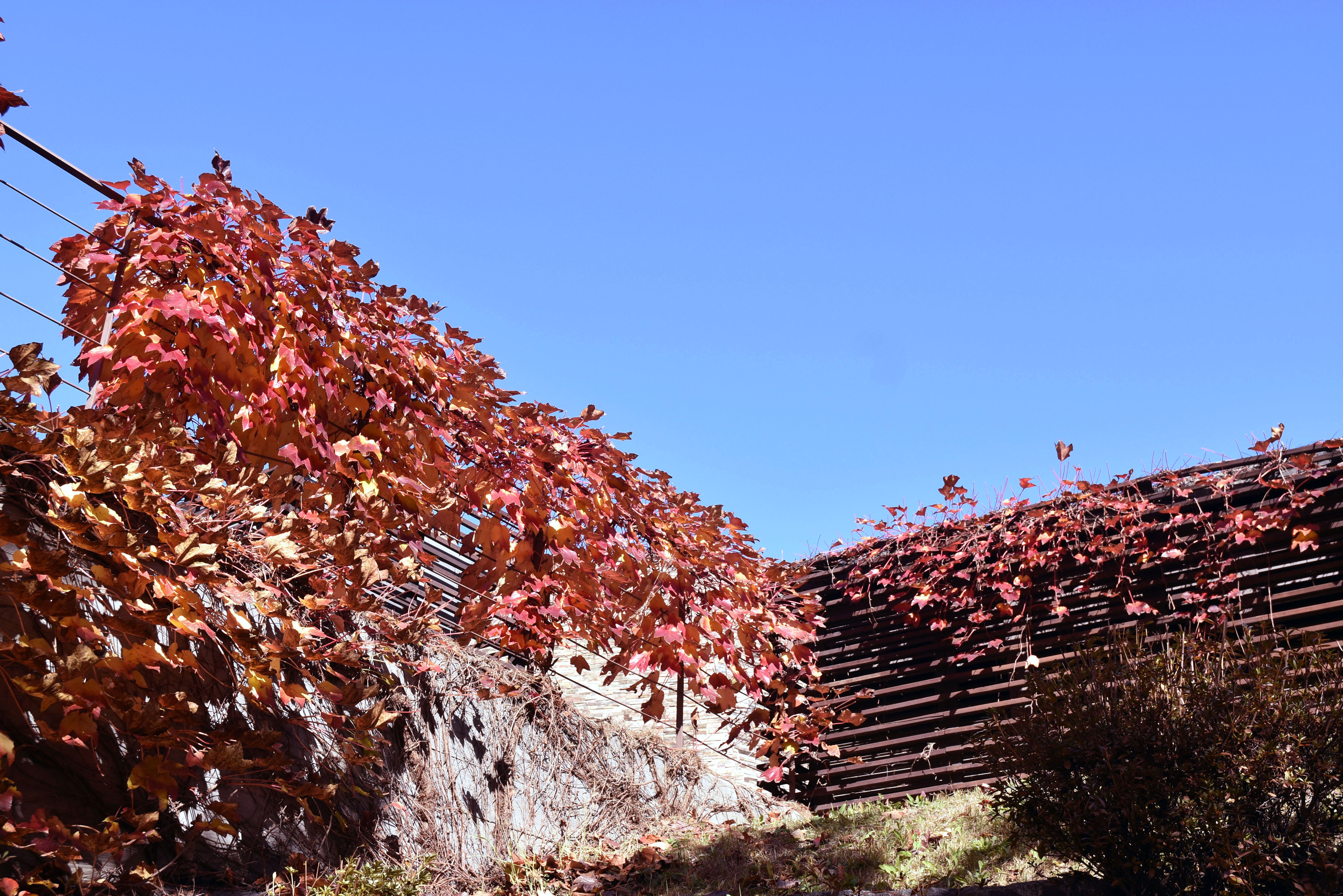 붉게 물들어가는 담쟁이와 노란 은행나무와의 조화