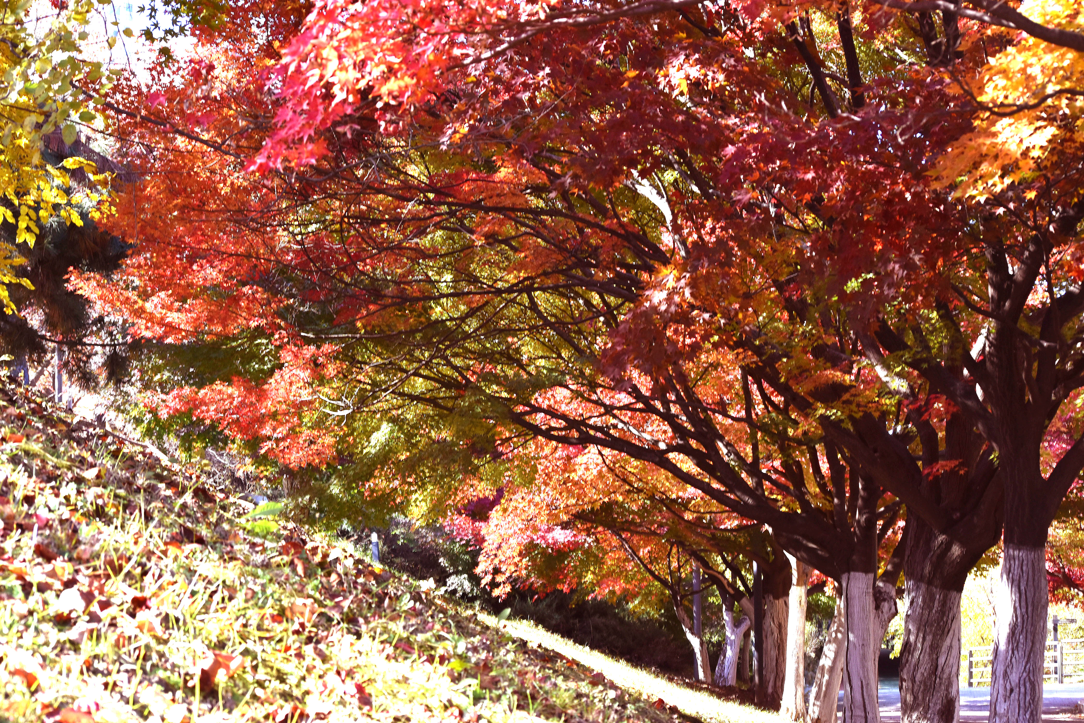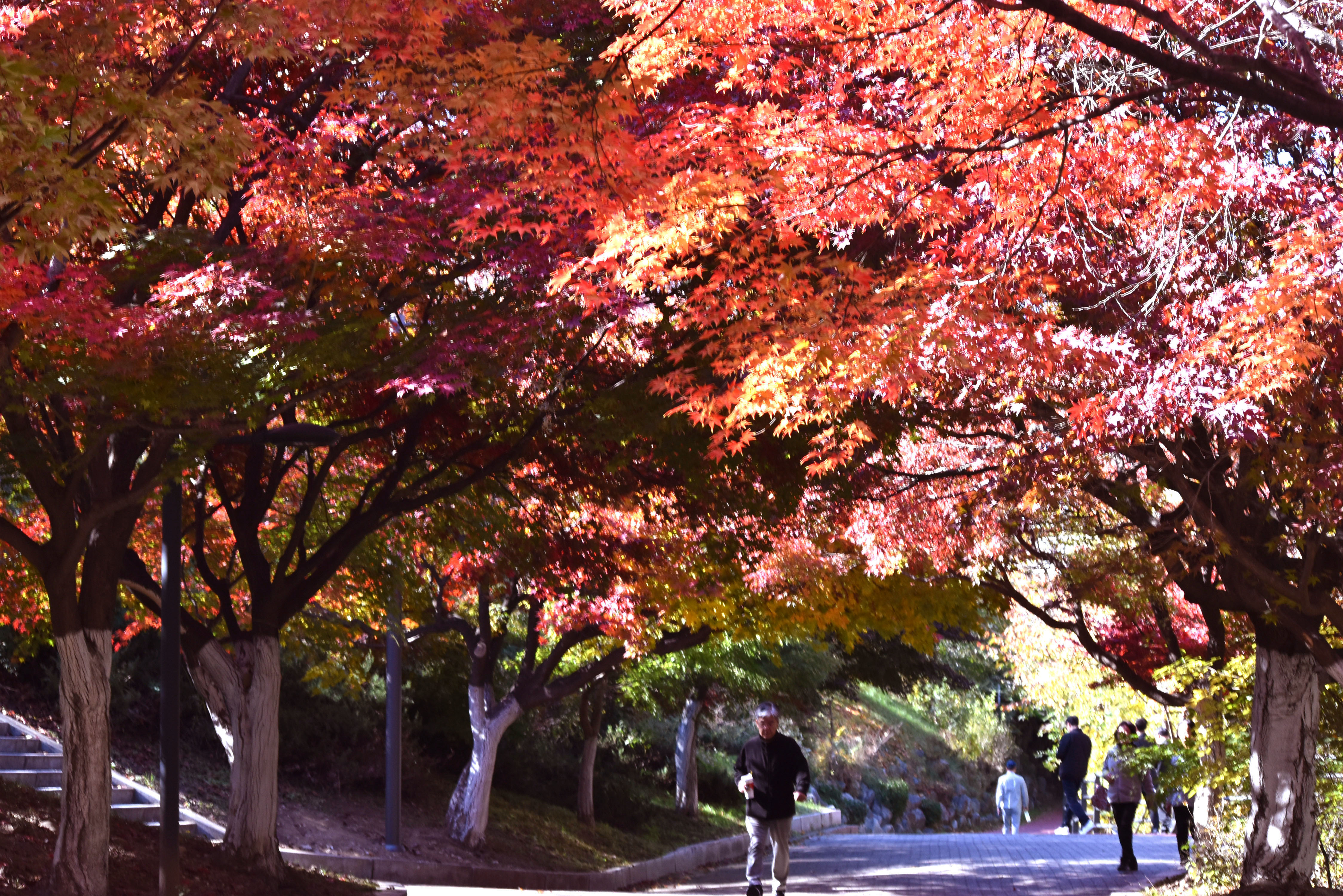 몽촌정 언덕가의 단풍터널은 아직 절정기에 못이르렀다