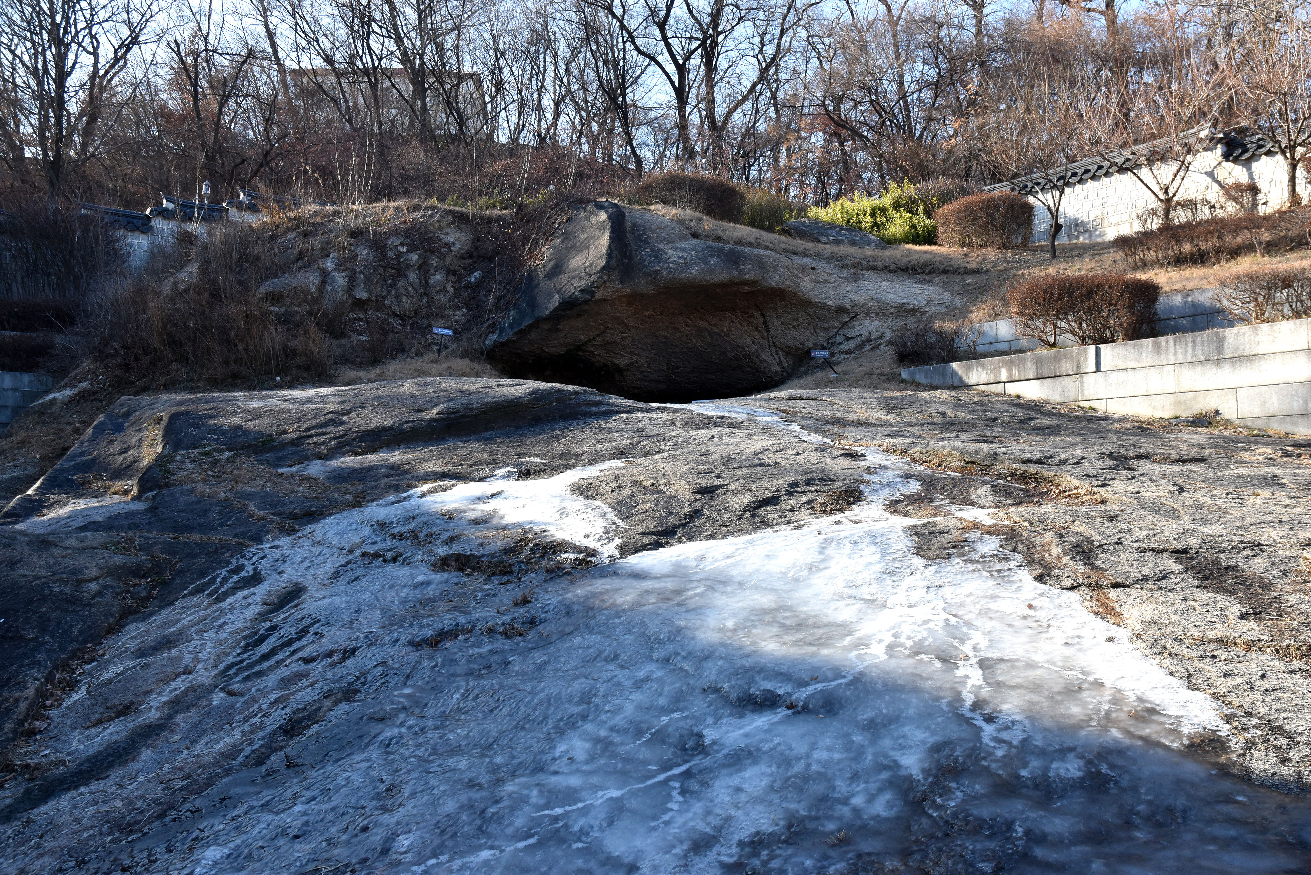 마르지 않는 샘물이 살짝 얼어있다